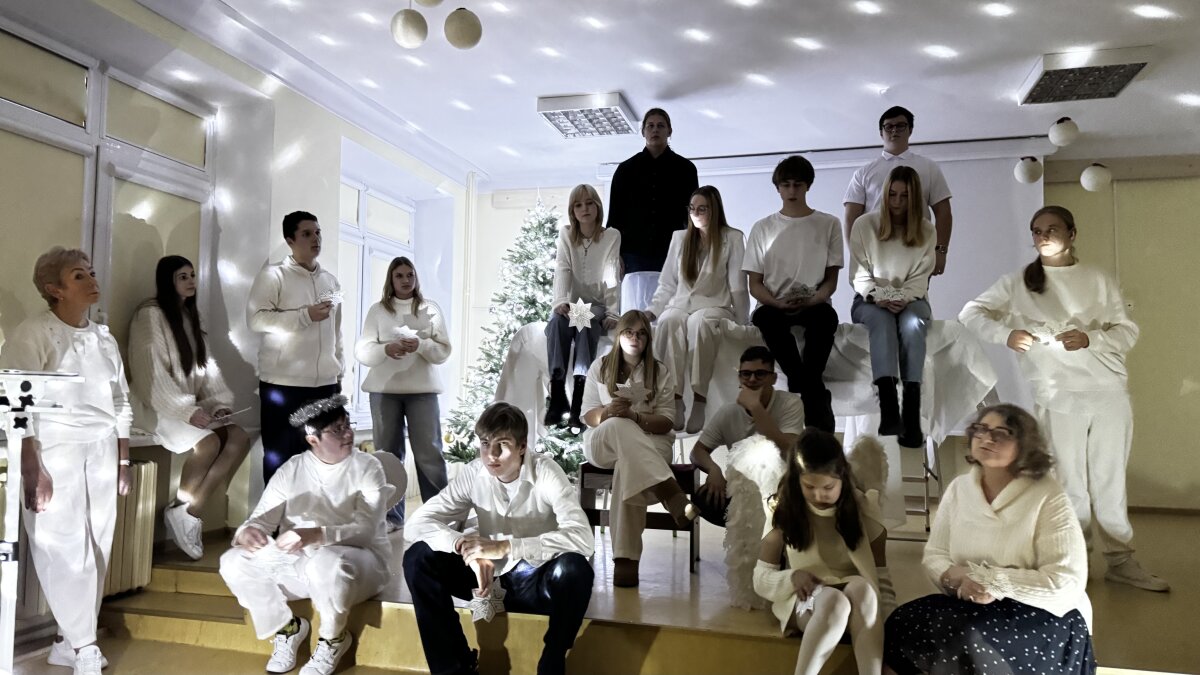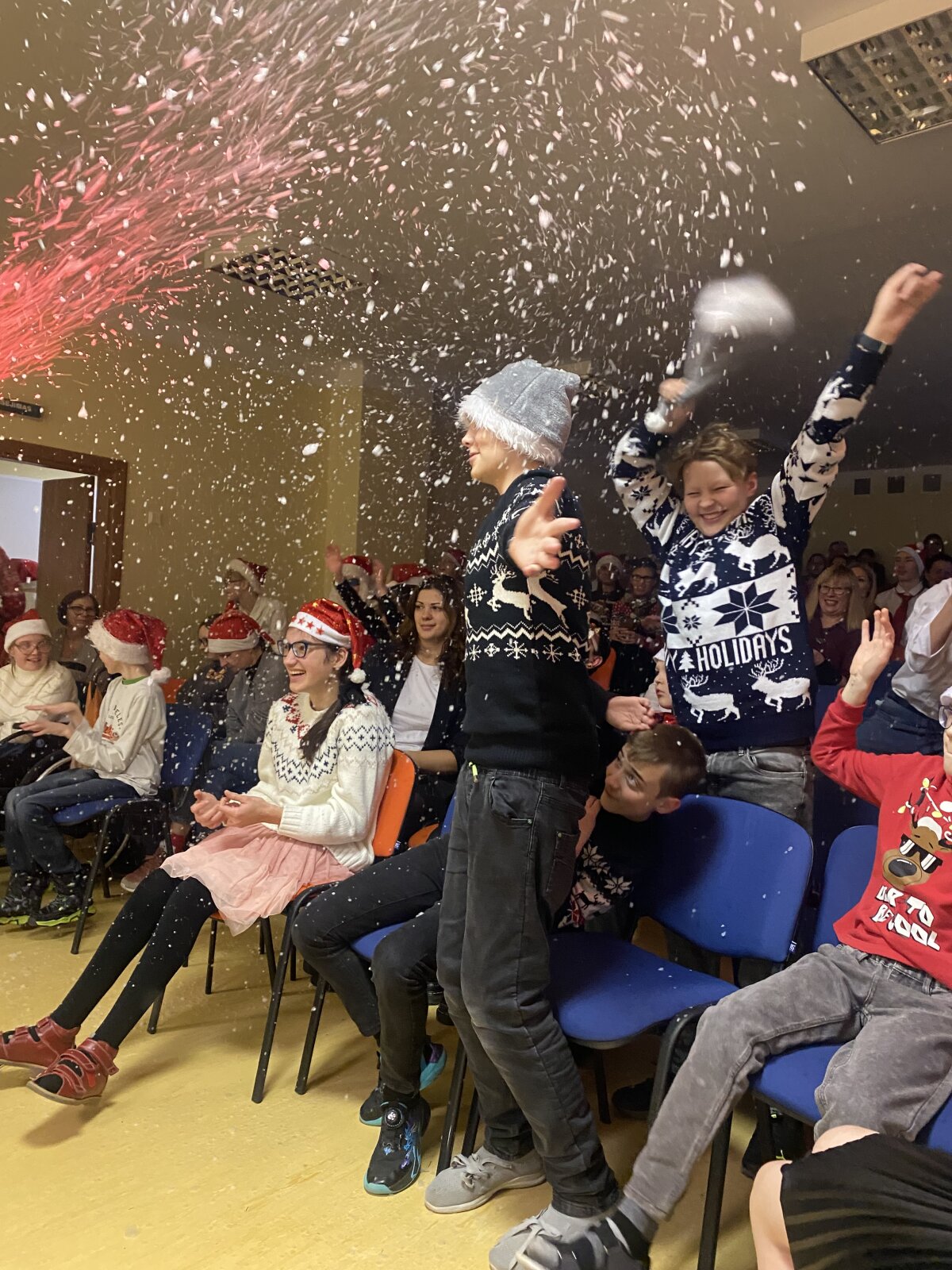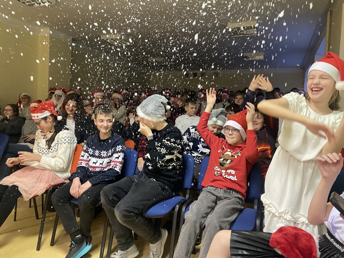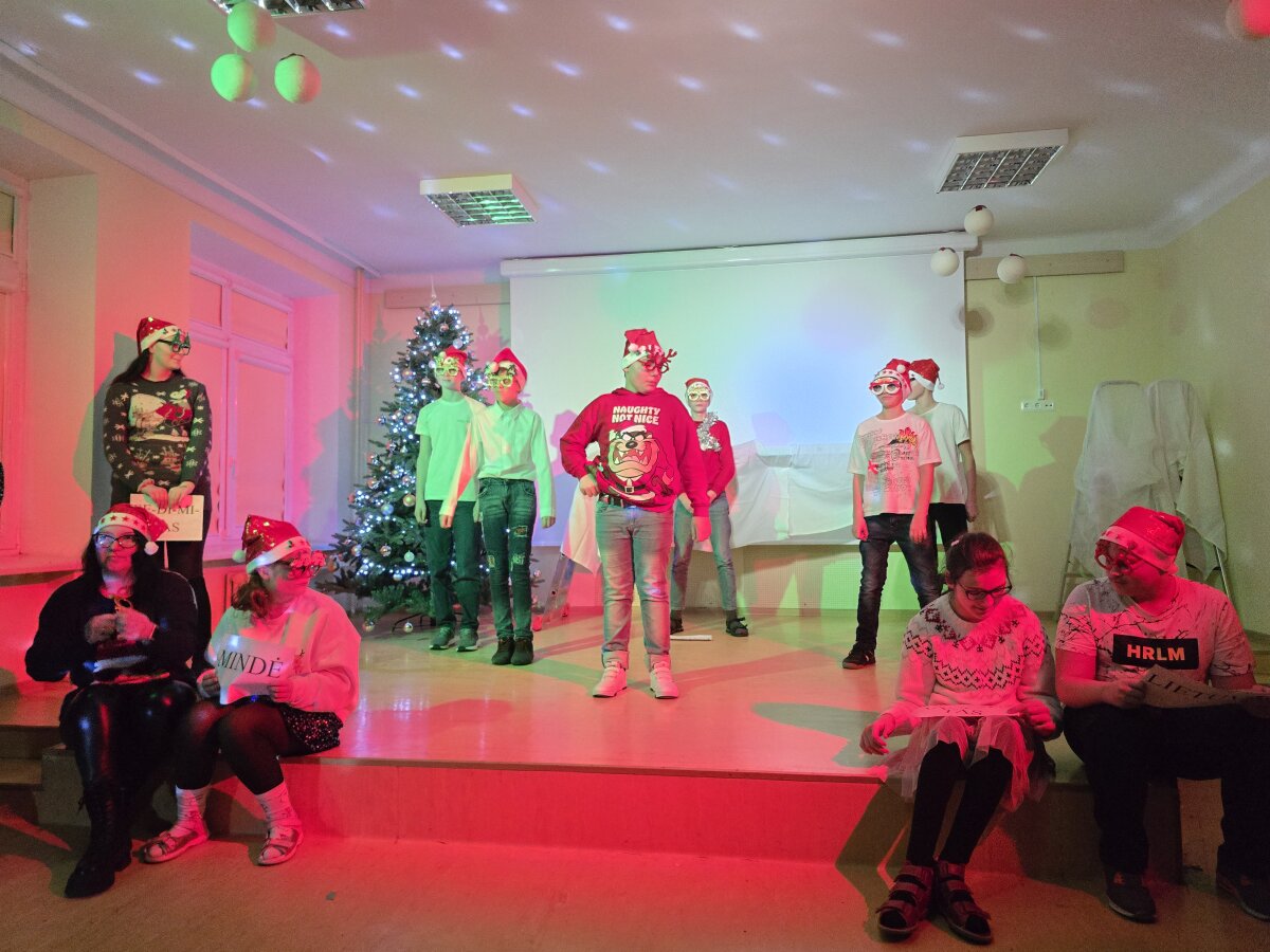 Paskutinį prieššventinį trečiadienį mokykloje sklandė pakili nuotaika ir bruzdesys klasėse, nes laukė jaukus pasisėdėjimas draugų būryje su šiltais apsikabinimais, palinkėjimais ir dovanų pasikeitimu. Iš ryto pradinukai žiūrėjo Kelmės mažojo teatro nuotaikingą spektaklį „Baisuoklis besmegenis“. Pavakary prie šventinės eglutės laukė susitikimas su Elfe ir jos magiškais burtais, jautrus dešimtokų pasirodymas, smagios penktokų, šeštokų, aštuntokų dainos, septintokų Šventinio bankucheno repavimas, devintokų muzikavimas varpeliais. O kokia šventė be Kalėdų Senelio ir jo dovanų? Kalėdų Senelis šį kartą atsiuntė savo Angelą sargą, kurį įpareigojo pagirti geriausiuosius, išdalinti visiems mokiniams dovanėles. Angelas su džiaugsmu paskelbė mokinius, mokytojų išrinktus „2025 metų Gerumo angelais“ ir įteikė jiems skirtas padėkas.