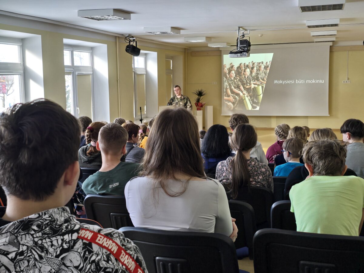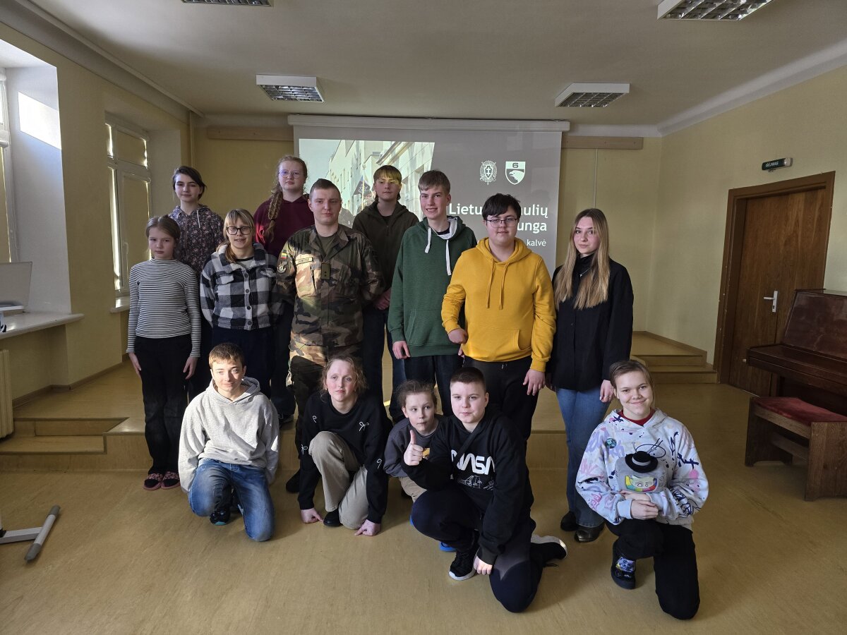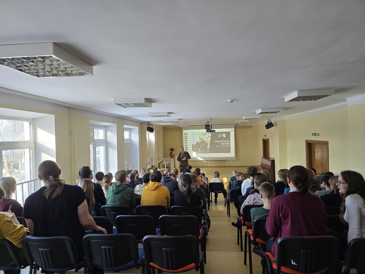 Nuo š.m. sausio iki kovo mėnesio mūsų mokiniai dalyvauja projekte „Lietuva širdyje: valstybinių švenčių kelias“. Ta proga centre viešėjo Lietuvos šaulių sąjungos narys Laurynas Bernotas. Šaulys pakvietė mokinius diskusijai, kas yra pilietis, pilietiškumas. Svečias supažindino su šaulių vertybėmis, kurias ugdo organizacija – patriotiškumą, atsakomybę ir pilietinį aktyvumą. Mokiniai sužinojo, ką reiškia būti šauliu, kaip galima prisidėti prie visuomenės saugumo bei stiprinimo. Laurynas kartu su mūsų mokyklos mokinių tarybos pirmininke, šaule Gabriele atsakė į mokiniams aktualius klausimus: kas gali būti ir kaip tapti jaunuoju šauliu, ką veikia jaunieji šauliai, ar mergaitės ir moterys gali būti šaulėmis, kokių reikia šauliui asmeninių savybių. Susitikimo dalyvius sudomino informacija apie šaulių organizuojamas mokiniams vasaros stovyklas.