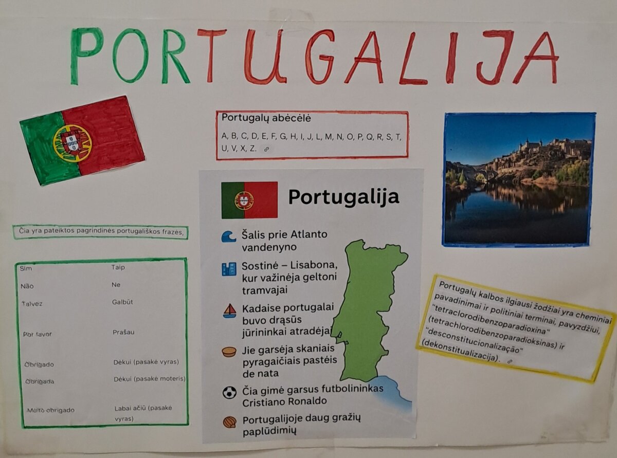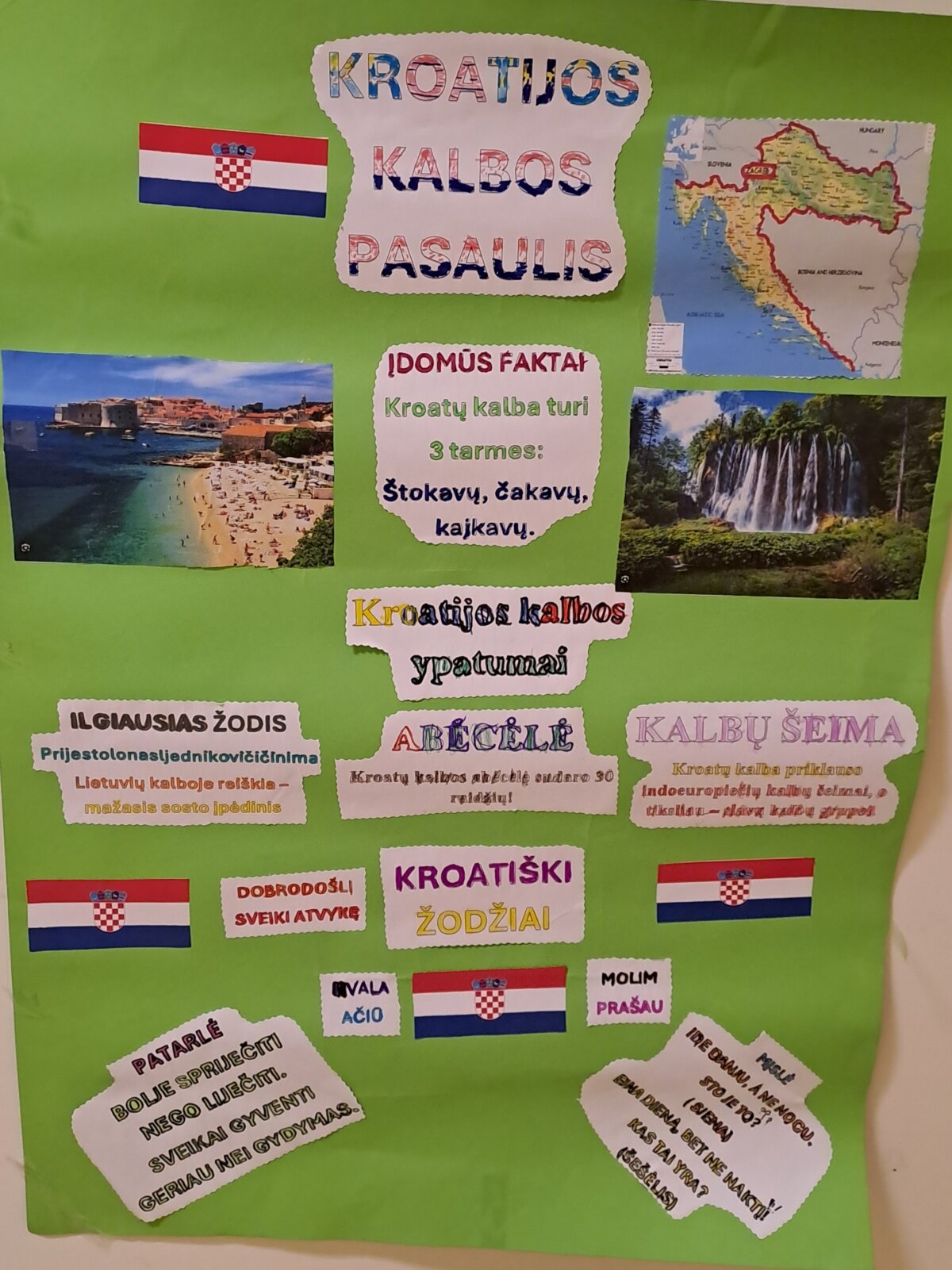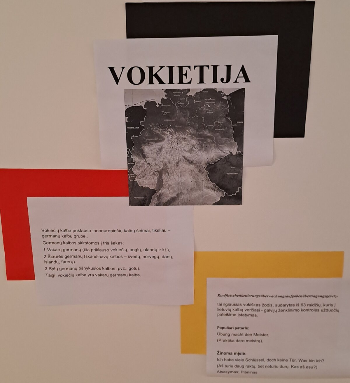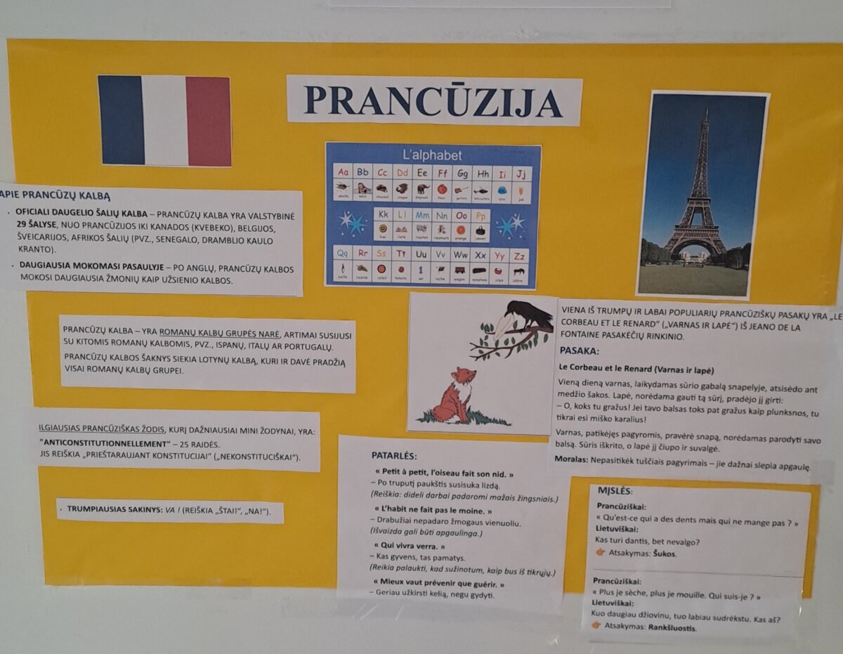 - „Europos kalbų laboratorija“. Kiekviena klasė gavo po vieną ES šalį – nuo Austrijos iki Lenkijos – ir ant klasių durų viešino kalbos ypatybes: abėcėlę, ilgiausius žodžius, patarles, pasakas. Mokiniai papildė ekspozicijas ir šalies faktais, vėliavomis bei žemėlapiais.