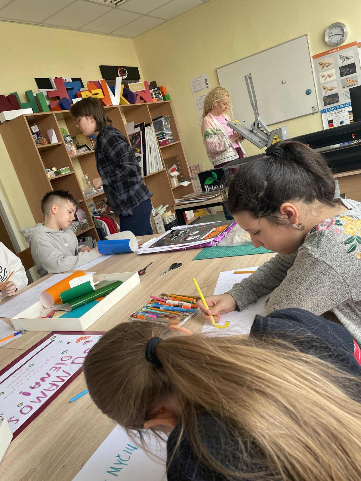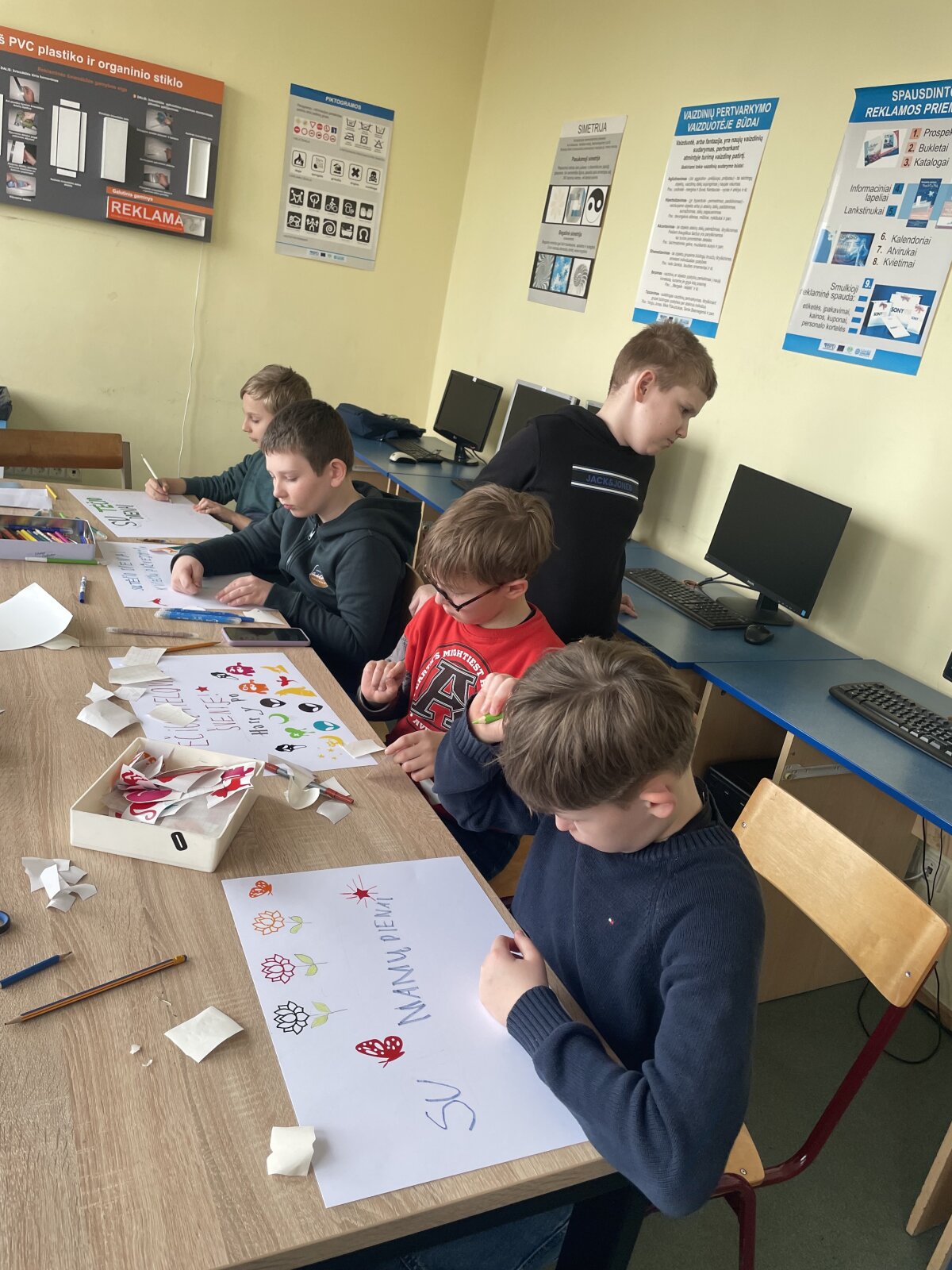 Remdamiesi pateiktais pavyzdžiais ir instrukcijomis, mokiniai patys kūrė reklaminius plakatus. Kūrybinio proceso metu jie pritaikė įgytas žinias, lavino savo meninius gebėjimus ir susipažino su pagrindiniais maketavimo principais. Sukurtus darbus mokiniai dekoravo lipnia reklamine plėvele.